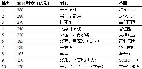 2010中国胡润女富豪前十排名一览: