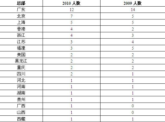 广东依旧以明显优势,位居企业总部所在地之首;北京今年增加2人,超越上海,居第二;上海保持5人,位于第三。