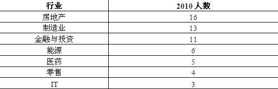 女富豪榜上,从事房地产行业的以16名位居第一;制造业以13位位居第二;金融与投资行业以11名位居第三。