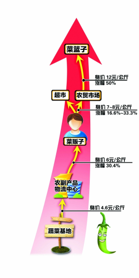 新华社“新华视点”记者日前调查发现:目前蔬菜生产和流通环节出现一些怪现象,从批发市场到城内的零售市场,蔬菜加价往往超过50%,其中少数菜品价格甚至翻倍。