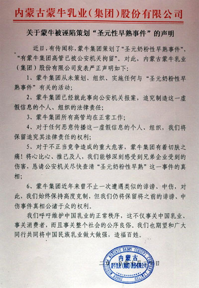 关于蒙牛被诬陷策划“圣元性早熟事件”的声明