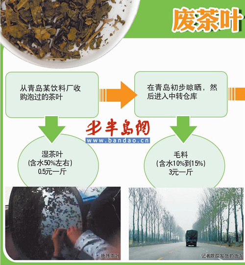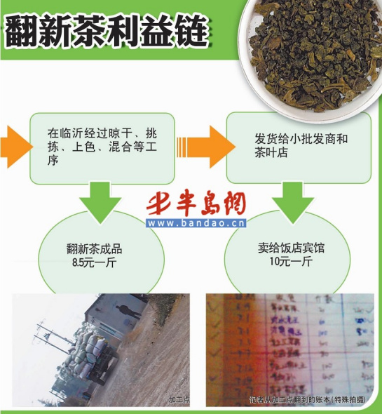 在那里,废茶叶在经过了五道工序之后,摇身变成了每斤售价近 10元的廉价茶。在那里,一本放在屋里的送货单,记录了这些廉价茶最终送到了哪里。就在记者继续针对翻新茶进行调查时,加工点却搬离了。目前,临沂市工商部门已经介入调查。