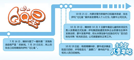 21日,内蒙古警方就有人在网络媒体发帖损害伊利商誉案做出通报,称案件已经基本告破,攻击伊利“QQ星”案件系蒙牛“未来星”品牌经理安勇等人的个人行为,与蒙牛公司没有关系。
