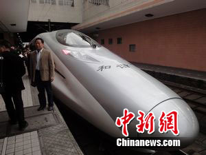 早在8点半左右,就已经有不少人迫不及待地站在站台上与“和谐号”合影留念。尤其是车头附近,更是引来旅客排队拍照。据工作人员介绍,“和谐号”车头的长子弹造型,就是350公里时速的标志。