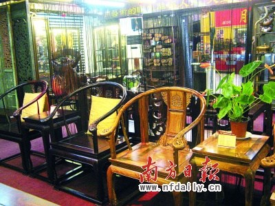 一位前来逛店的广州天盛装饰的年轻老板黄丹雁告诉记者,办公室想添置一套比较上档次的家具,就来这边看看。逛店中,他对一套标价为29万元的越南黄花梨的皇宫椅表示十分满意。