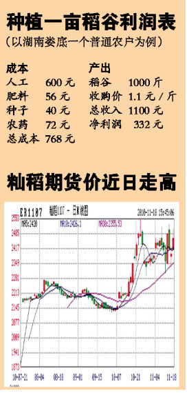 虽然稻谷收购价出现明显上涨,但农民受益却有限。今年部分产区晚稻产量降至800斤/亩,按1.2元/斤的收购价计算,一亩地收入为960元左右。而去年的产量一般为1000斤甚至以上,即使是按0.95元/斤的收购价格计算,收入也有950元。但今年种子、化肥、人工等费用都有一定程度的上涨。