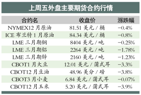 纽约商业期货交易所(NYMEX)的原油期货略跌0.4%,收报81.51美元/桶;伦敦金属交易所(LME)的有色金属也大多收跌,但铜、铝、锌三个品种的跌幅都在2%以内。