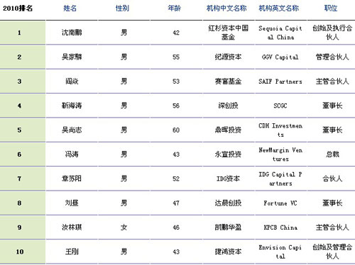 中新网12月7日电 《福布斯》中文版网站今日发布了2010年度最佳创业投资人榜单,红杉资本沈南鹏、GGV 纪源资本吴家驎(Thomas Ng)、赛富基金阎焱摘得前三甲。