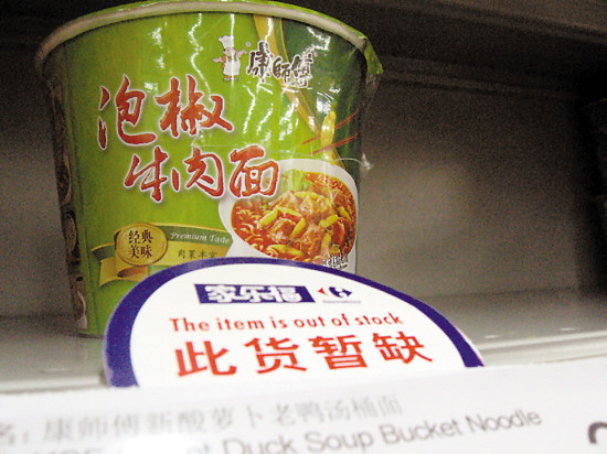 据记者了解,目前广州家乐福市场的康师傅方便面存货已经不多。