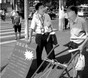 前几天,记者在浙江中路北京东路口看到,一名年轻男子在人行道上摆出一块1平方米大小的广告牌,大红的底色十分鲜艳,黄色的宣传语更让人弹眼落睛:“开户送大礼!”——只要到附近一家国信证券公司营业部开设上海和深圳两市的股票账户,并且资产或交易量达到一定金额,就能获赠各种礼品,包括100元至5000元的联华OK消费卡、1000元至3000元的智能手机、3200元的电脑软件等。