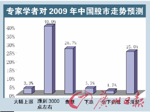 对于今年的形势,54.2%的专家认为宏观经济形势将保持平稳发展;80%的专家认为房地产市场将继续调整;40%的专家认为股市将恢复上涨到3000点左右……