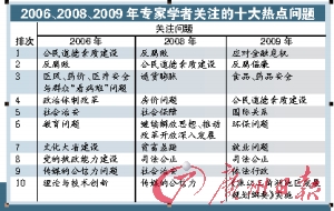 调查显示,反腐倡廉和公民道德素质建设依然位于专家学者关注的十大热点问题前列,分列第2位和第4位。