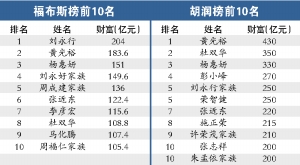 继本月初胡润“率先”公布《2008胡润百富榜》之后,记者昨日在《福布斯》中文版上也看到了其《2008年中国富豪榜》,或许刻意强调与胡润的区别,或许这一个月来全球资本市场动荡影响确实不小,福布斯的榜单,不仅前10名与胡润座次“大变样”,就连“身家”也是相差甚远。福布斯昨日披露的首富刘永行在胡润榜单中仅列第5,胡润的首富黄光裕也被福布斯放在第2的位置上,而财富总额也由胡润榜中的430亿元骤降至183.6亿元。另外,杨惠妍在胡润榜里财富总额达330亿元,但在福布斯榜里是151亿元。福布斯制榜人指出,富豪的财产是根据最新股价得出的。