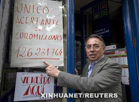 欧洲知名博彩项目“欧洲百万”自3月20日以来已经连续6周没有开出头奖,直到本月8日,一名彩民在西班牙马德里中得该奖,获得超过1.26亿欧元(约合1.68亿美元)奖金,打破这一博彩项目保持近4年的最高奖金纪录。