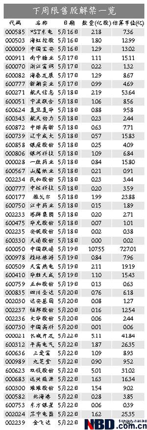 市场人士认为,下周限售股解禁压力集中在中小板的 “大小限”和有增发限售股解禁上市的这类公司上,而股改限售股的压力较小。