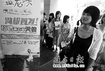 德庆盘龙峡2万元周薪招聘“薰衣草天使”活动进入了现场招聘环节。记者昨日在招聘现场看到,应聘人需先填写报名表格经过第一关面试,过关后进入第二关———拍照,而第二关让不少人笑称为“选美比赛”。