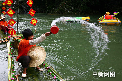 中新网广州5月26日电(记者 莫非 通讯员 慧子)十多艘用竹作为材料扎制成的龙舟,长3.8米,宽1米,前方高翘,呈龙头形状,并且四周遍插五颜六色的鲜花,游客在船上打水仗、泼水、沐午时水,欢笑声不断。而漂亮的花龙舟从广州流溪河源头顺流而下,徜徉在从化响水峡的漫天花海中,格外壮观。
