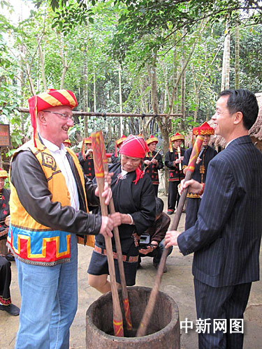 一路上,鲍姆加藤先生兴致勃勃地听着导游小阿妹对原住民文化的介绍,时不时用幽默的语言表达他对这些古老的民族传奇的兴趣。在聆听了原汁原味的八音古乐之后,鲍姆加藤先生还主动参与到欢乐的游客队伍中,同黎家文身老人跳上一支樁米舞,感受到了别样的少数民族热情。