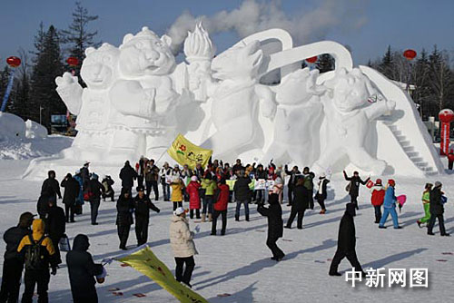 在长白山西坡门区,大型雪雕“长白虎迎亚运五羊”格外引人注目,两只长白虎与广州亚运会吉祥物五只可爱的小羊共举火炬,这个长28米、 高15米、宽16米的雪雕,创下了长白山历年雪雕的新纪录。