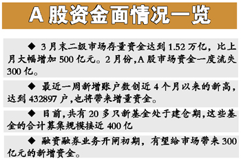 由上海证券报和申银万国研究所联合推出的股市月度资金报告显示,今年3月末,A股市场的存量资金在经历了近3个月的盘底振荡后开始上升,当月末二级市场存量资金达到1.52万亿,比上月大幅增加500亿元。这个迹象,使得二月份一度明显流失的市场资金面再度回稳,此前的2月份,A股市场资金一度流失300亿。