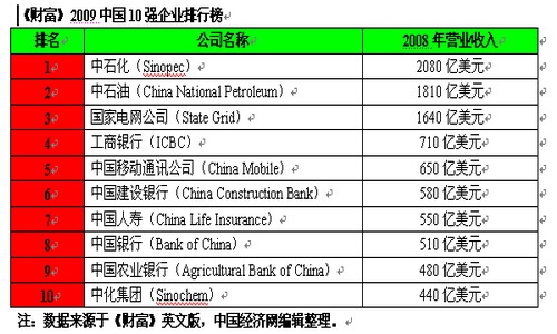 美国《财富》杂志英文版10月13日公布了中国10强公司排行榜,中石化以2080亿美元销售收入(2008年数据)名列第一位,中石油排名第二,2008年销售收入为1810亿美元。排在第三位的是国家电网公司,2008年营业收入为1640亿美元。