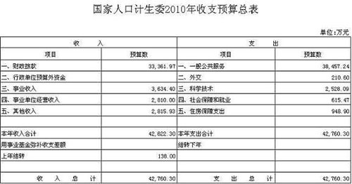 中新网4月8日电 国家人口和计划生育委员会7日在其官方网站公布2010年部门预算。预算显示,国家人口计生委2010年预算收入总计42760.30万元,其中财政拨款33361.97万元;2010年预算支出总计42760.30万元,其中一般公共服务项目预算支出为38457.24万元, 住房保障支出948.90万元。