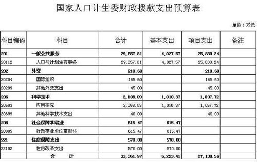 本表按支出功能分类科目编制,反映国家人口计生委年度部门预算中财政拨款支出的总体情况,按照基本支出和项目支出划分。