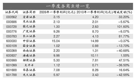 对此业内人士认为,券商行业是一个明显靠天吃饭的行业。随着融资融券与股指期货的开通,这种状况会有所好转,但由于目前上述业务规模较小,因此这种靠天吃饭的局面短期内不会发生根本性改变。此外,虽今年一季度指数运行点位较去年一季度高,但成交活跃度与佣金率明显下降,导致券商收入中占比最大的经纪业务收入下滑。因此自营业务收益的好坏成为左右净利润增幅的关键。而股指一直处于震荡,自营投资操作难度加大,最终导致多数券商业绩出现同比和环比双降。
