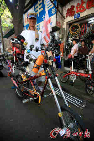 昨天,在海珠中路的一家车行,骑着这辆“怪车”的李先生一停下,就被路人团团围住。李先生告诉记者,自从自己买了这辆车后几乎每周都要给这辆车改造一番。今天加个铃铛,明天加个水壶。想到了什么就改点什么,看到自行车铺就进去逛一逛。三个月下来,一辆普通自行车就成了现在的模样。