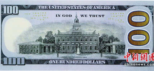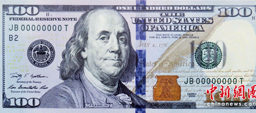 美国财政部公布了新版100元美钞的照片,钞票上同样仍是美国开国元老之一的富兰克林(Benjamin Franklin)肖像,但钞票正中央多了一道蓝色的3D立体安全图样,随着角度不同,可以变换钟或数字100的图型。
