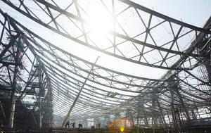 “整个南站用钢5.7万吨,相当于1949年全国钢产量的三分之一。”施工现场一名工人说,南站的用钢量已超过奥运主体育场鸟巢的1.35倍,由近百万件钢构件组成。其中主站房椭圆型屋面中央部分还安装了太阳能光电板进行发电供南站使用。
