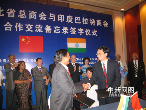 中新网武汉7月24日电 (艾启平 刘俞君)湖北—印度经贸合作洽谈会24日在武汉举行。洽谈会上,湖北省总商会与印度巴拉特商会签署了合作交流《备忘录》,期望搭建起湖北与印度企业界交流合作平台。