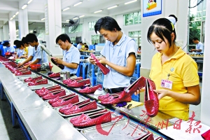 东莞一家制鞋厂的工人正在正常生产。