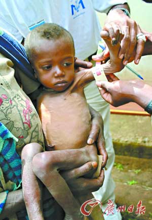 图:埃塞俄比亚一营养不良的儿童在接受医疗人员的诊治