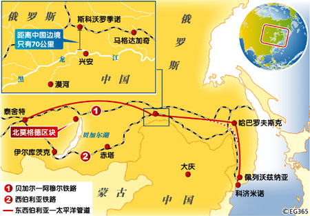 中俄油管可被视作俄罗斯东西伯利亚-太平洋石油管道一期工程伸向中俄边境的支线,从阿穆尔州的斯科沃罗季诺出发,抵达中俄边境。进入中方境内后,最终与石油重镇大庆相连。
