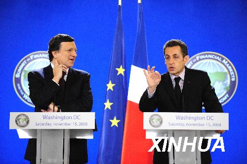 11月15日,在美国首都华盛顿出席二十国集团领导人金融市场和世界经济峰会的法国总统萨科齐(右)和欧盟委员会主席巴罗佐联合举行新闻发布会。 新华社记者张岩摄