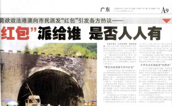给东莞户籍市民发红包缘于澳门向居民发红利的启发。4月底,东莞市委书记刘志庚在提出这个想法时,将其称为“临时生活补贴”。在构想提出不到两个月,红包发放方案便出笼了,被列入此次临时生活补发范围的七类人群是:低保对象、五保户、非低保对象的优抚对象、非低保对象的一至四级残疾人、弃婴、已治愈的麻风病人和低保边缘户。发放标准为每人1000元。(唐波、李志坚、周乐易)