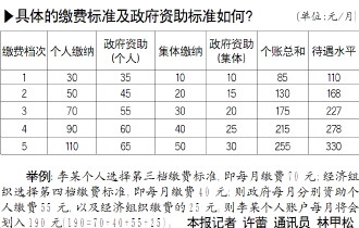 最低的个人缴费标准确定为30元,以20元为级差,向上设立五个档次的缴费标准,最高一档为110元。参保农民可根据各自的经济承受能力自愿选择一档缴费,多缴多得。《办法》对经济组织设计了5个档次的缴费标准,从10元至50元不等;对于确无经济能力的经济组织,也可以暂不为参保人缴费。