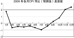 对于2009年CPI同比走势的预测,我们主要考虑到以下三个方面因素:一是近期食品和非食品价格的运行趋势;二是历年(2001年-2008年)各月CPI的环比平均值;三是在1-2月间移动的春节因素对CPI环比的影响。
