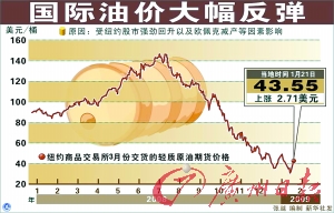 到当天收盘时,纽约商品交易所3月份交货的轻质原油期货价格上涨2.71美元,收于每桶43.55美元,涨幅超过6%。伦敦国际石油交易所3月份交货的北海布伦特原油期货价格当天上涨1.40美元,收于每桶45.02美元。 (文/表记者陈芳)