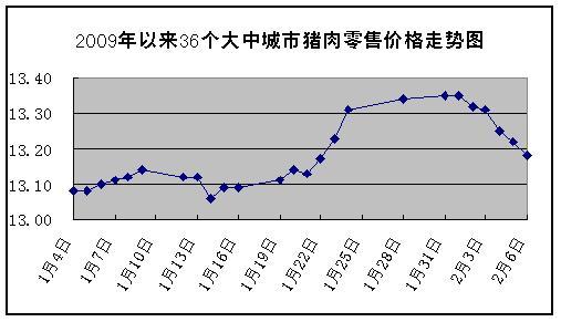 中新网1月19日电 据国家发展改革委价格监测中心监测,上周(2009年2月1日~2009年2月6日,下同)全国36个大中城市集市、超市猪肉(精瘦肉)平均零售价格每500克为13.27元,与春节前一周(2009年1月19日~2009年1月24日,下同)相比上涨0.68%。