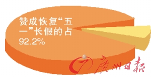 据了解,两会以来,已有数十名代表委员在两会的各个场合为“五一”黄金周大声疾呼。而在网上的调查中,网民对恢复“五一”黄金周的提议支持率也很高,在人民网“你是否赞成恢复‘五一’长假”的调查显示,共有500多万名网友参与了网上调查,其中赞成恢复“五一”长假的占92.2%。