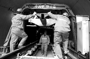 昨日,马家堡西路铺轨基地,地铁4号线开始铺轨。记者 韩萌 摄