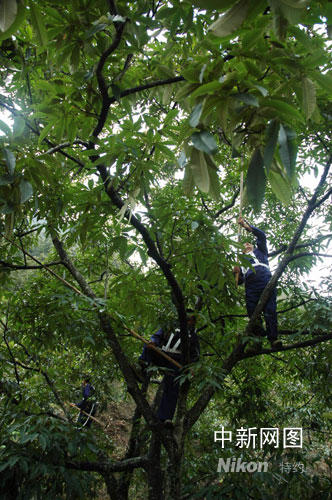 临安村民在山核桃树上击打山核桃。作者:龚读法
