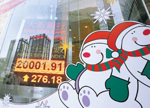 中新社香港十二月二十八日电 (记者 齐彬)在中国内地股市带动下,香港股市在圣诞长假后持续攀升,恒生指数今天首次突破两万点大关,而国企指数也升至一万零三百六十三点,双双创下新高。