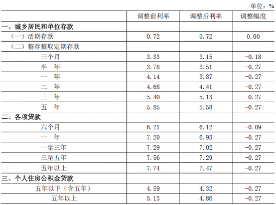 金融机构人民币存贷款基准利率调整表