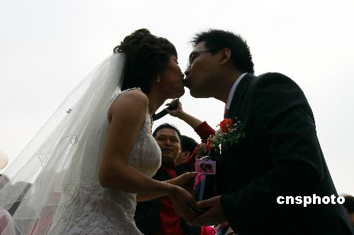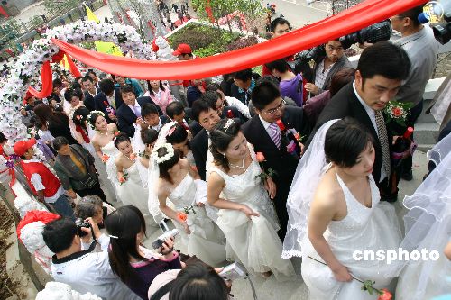 2007年5月1日,南京市妇联、旅游局等单位在阅江楼景区举办“五月新娘”大型公益集体婚礼活动。包括7对金婚、银婚、纪念婚夫妇在内的百名新人参加了婚礼,体验明朝皇家婚典,接受亲友和游客的祝福。中新社发 阿董 摄
