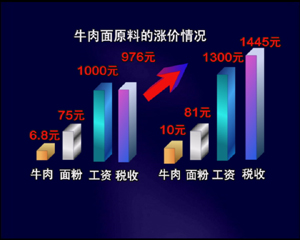 马俊礼对近两年牛肉面原料的涨价情况进行了这样的描述:牛肉由原来的6.8元一斤涨到了现在的10元,面粉由原来的每袋75元涨到了现在的81元,拉面工的工资则有原来的1000元,涨到了现在的1300元,每年的税收也有976元涨到了每年的1445元。据了解,兰州全市上半年物价指数上涨了3.7%,而食品行业则上涨了6.7%。