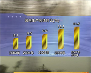 国内生产总值同比增长11.5 意味怎样的增长速度呢,这是2003年度到2006年度GDP增幅情况,从历史数据看出,2007年上半年GDP的增幅已经达到历史最高,事实上在2007年年初,国家制定GDP的目标是8%,而2007年一季度已经高达11.1%.二季度增幅又有了新的突破,这自然引发了人们对经济是否过热的关注。