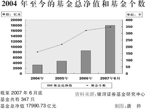 最新统计数字显示,截至今年6月底,全国的基金规模已达12399.96亿份,比年初时的6220.67亿份增长了近一倍。